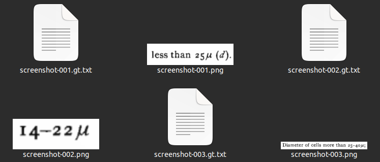 First, we need some “ground truth” data for training. These should be image snippets from our document(s), with the corresponding text attached. There are scripts to generate all possible image snippets in a page. But here we are mostly interested in the microns and other special symbols, so I decided to simply take screenshots of possibly-important text. I took 52 screenshots from a couple of the other pages in the book (you can experiment with more), and threw them into a folder. This folder must be named {language}-ground-truth/, so I named it alg-ground-truth/ (download it here to follow along). Here are a some of the screenshots: