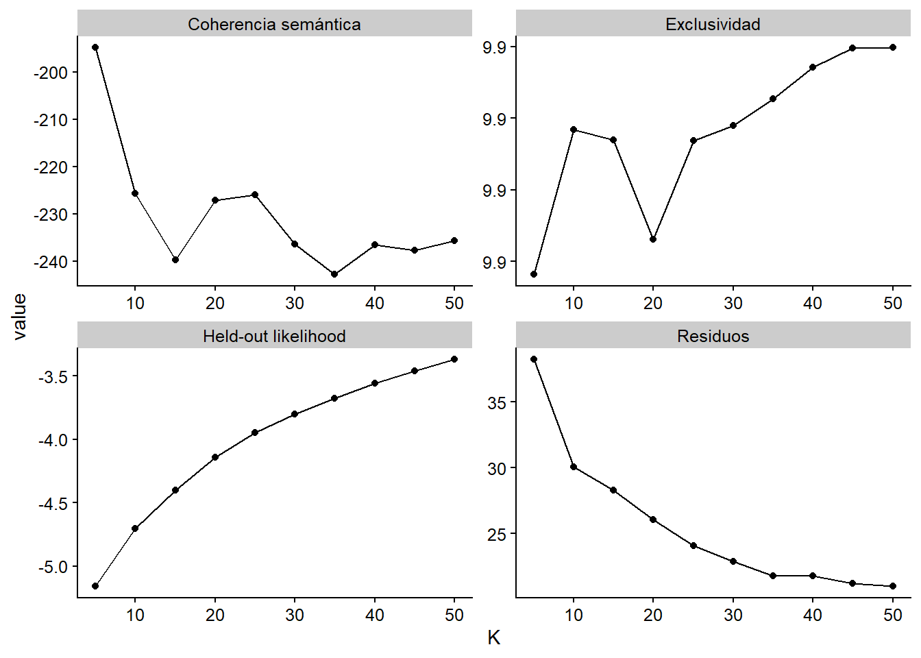para obtener más términos que caracterizan este tema, como se muestra en el resultado a continuación. Los términos con mayor probabilidad son los mismos que utilizamos en el gráfico anterior, los más comunes en el tema. Otra medida interesante es “FREX,” que selecciona términos que son distintivos de este tema, en comparación con otros (en este caso, las palabras son las mismas). Por último, “Lift” (elevación) y “Score” (puntuación) se importan de otros paquetes (M. Roberts, Stewart, and Tingley 2019), y también pueden ser útiles al describir un tema. En este caso, observe cómo los términos principales de “Lift” incluyen “olafeminista,” uno de los hashtags que discutimos anteriormente.