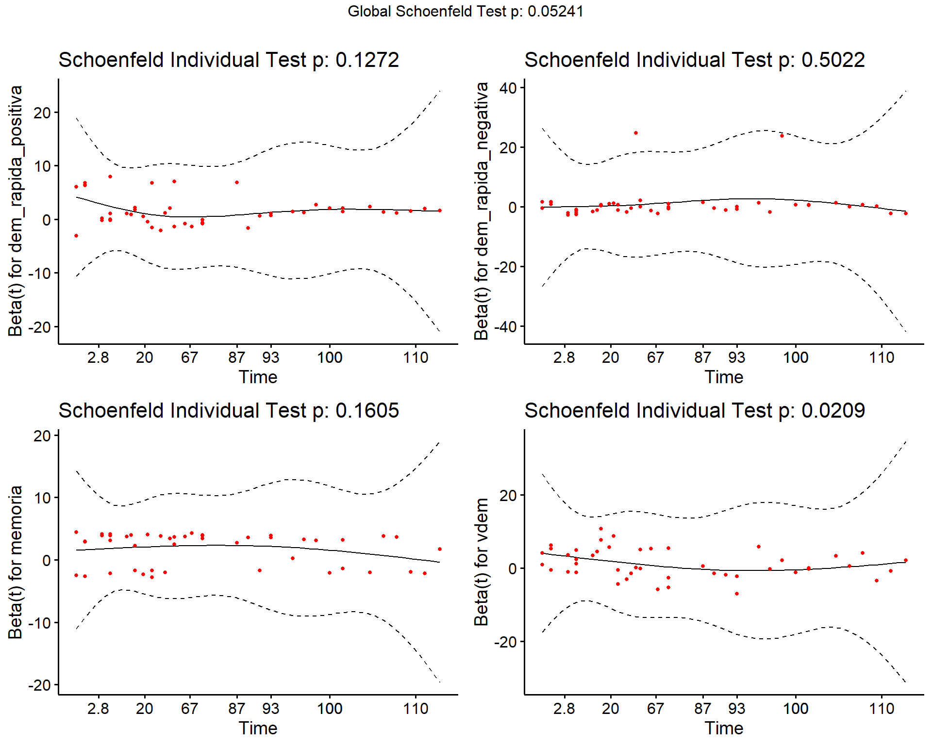 La ventaja del modelo de Cox sobre sus contrapartes paramétricas es que existen tests para saber si alguna variable de nuestro modelo rompe el presupuesto de proporcionalidad de los riesgos, y de esa forma podremos corregirlo generando interacciones entre estas variables y variables temporales. De esta forma, permitimos que en nuestro modelo haya dos tipos de coeficientes: coeficientes constantes en el tiempo, y coeficientes cambiantes en el tiempo. Por ejemplo, podemos imaginar que, ante un aumento brusco en la calidad de las instituciones democráticas de un país, la tasa de riesgo de implementar democracia directa se dispare y que dicho efecto de desvanezca en el lapso de cuatro o cinco años. Cuando definas tu modelo, es importante que reflexiones sobre qué variables puede asumirse que permanezcan constantes en los riesgos y cuáles no.